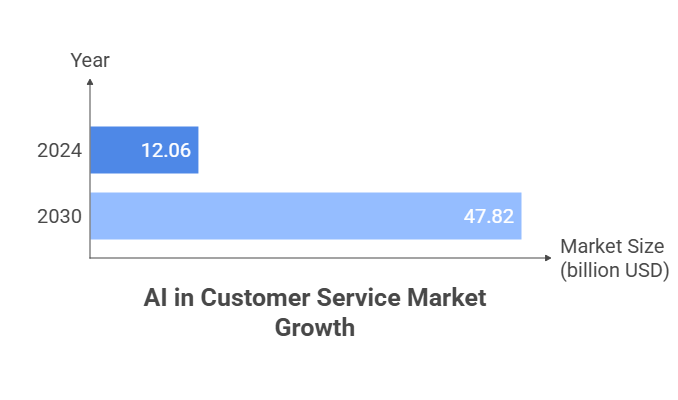 According to Markets and Markets, the market size for AI in customer service was valued at USD 12.06 billion in 2024 and is predicted to reach USD 47.82 billion in 2030, at a CAGR of 25.8%.